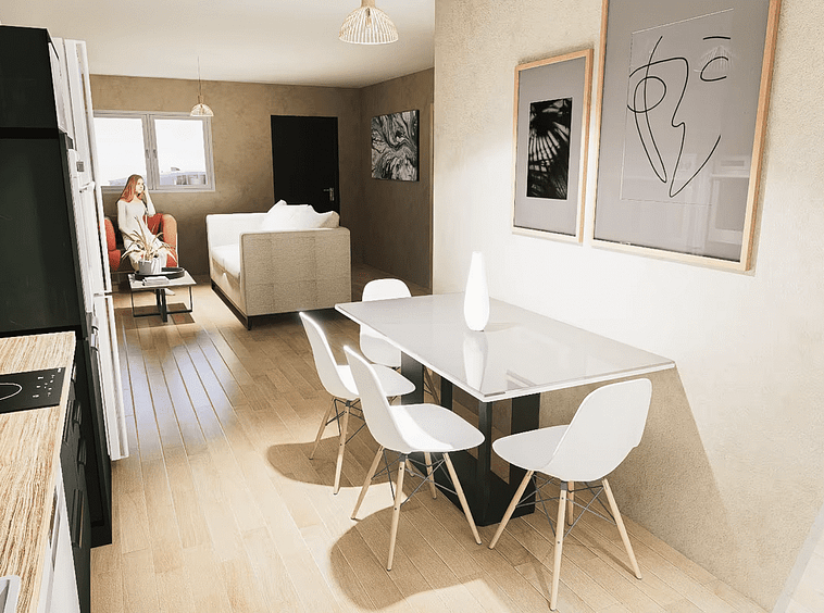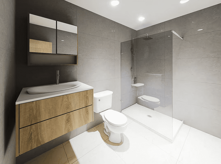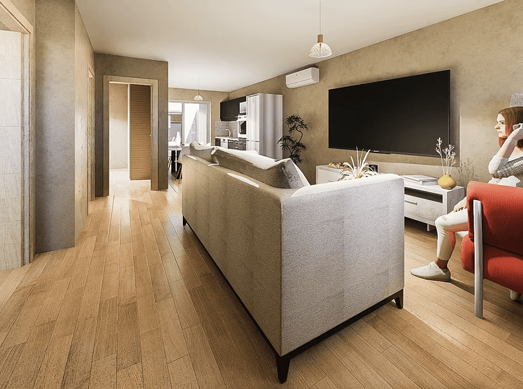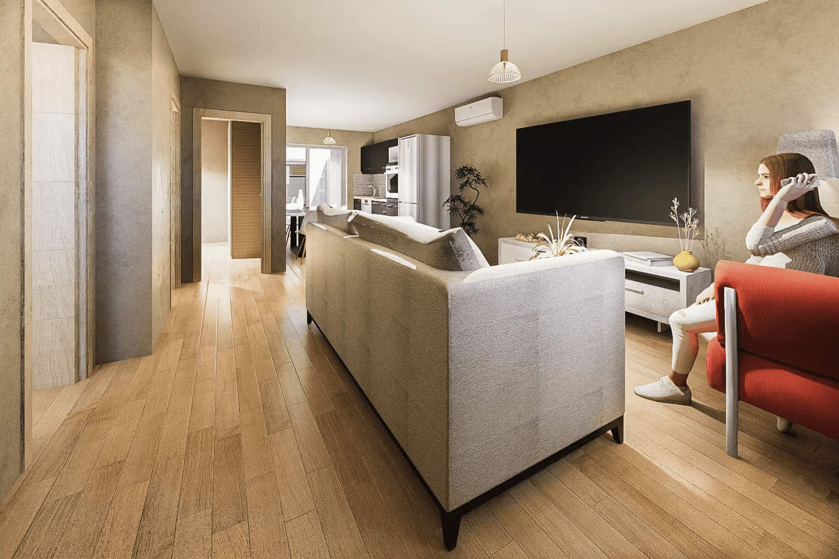 Acabados de calidad: ventanas PVC con climalit, puertas blindadas, suelos vinílicos SPC y revestimientos cerámicos de diseño.