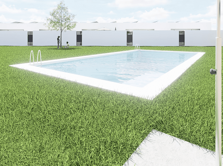 Urbanización cerrada con piscina comunitaria y zonas verdes.
